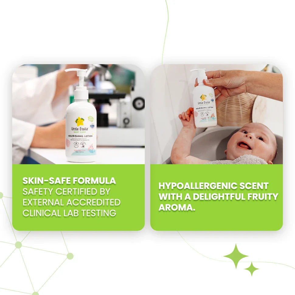 Little Étoile Baby Care Nourishing Lotion uses an advanced scientific formulation to deliver soothing, all-day moisture and essential nourishment for your baby's delicate skin. Our Nourishing Lotion is enriched with our unique ShineOn BlendTM of Glycerin, Panthenol & Cucumber that keeps the skin in tip-top shape, as well as 6 nourishing oils to combat dry skin & support the skin’s natural protective barrier. Experience pure delight with our unique scrumptious peach and raspberry fragrance blend.