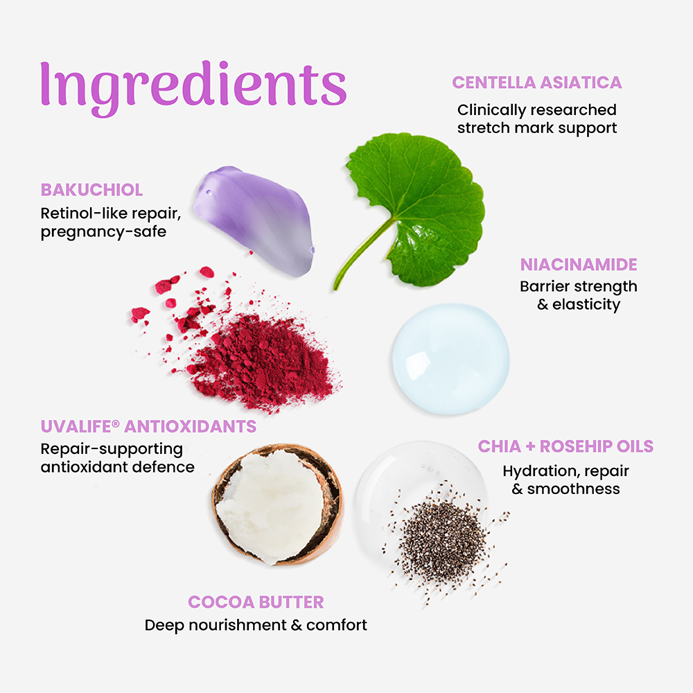 A gentle, nourishing body cream designed to comfort and support skin through stretching and change — especially during and after pregnancy. With omega-rich oils, plant butters, and antioxidant actives, it deeply hydrates and helps maintain supple, healthy-looking skin.