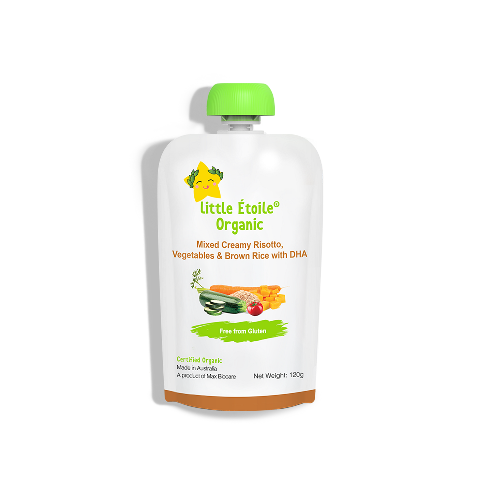 Creamy Risotto, Vegetables & Brown Rice is a delicious blend of rice and vegetables with the added goodness of omega-3 (DHA). Suitable for infants 6+ months, this savoury meal is full of yummy flavour with a smooth, creamy texture for your little étoile to enjoy!