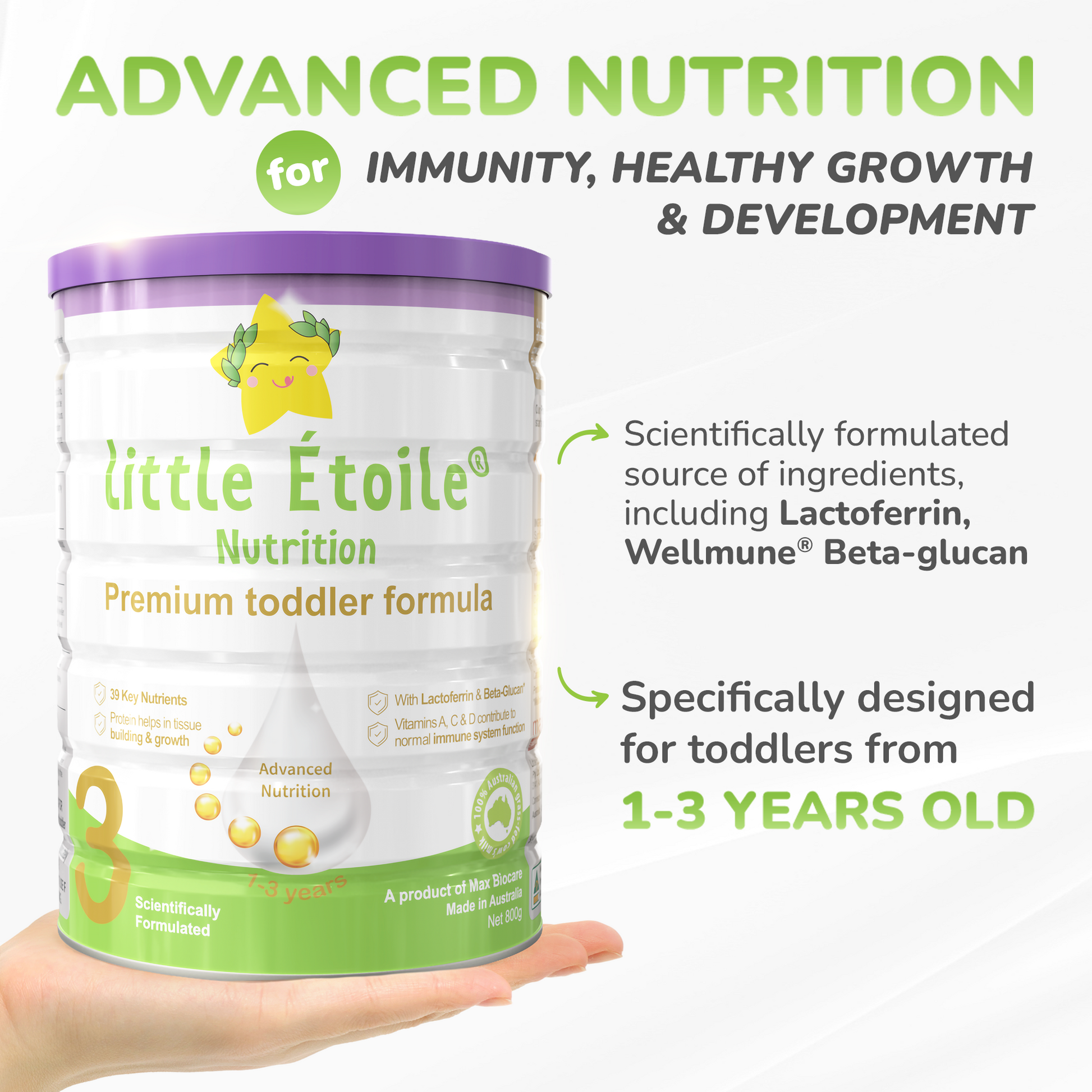 Little Étoile Stage 3 Premium Toddler Formula provides a complementary source of nutrition, with scientifically validated, premium-quality ingredients, including protein from grass-fed Australian cow’s milk. Backed by 20+ years of expertise in pharmaceutical and nutrition science, Little Étoile® Nutrition is dedicated to supporting the second part of the first 1000 days, when children rely on their own nutrient intake for their increasing growth demands.